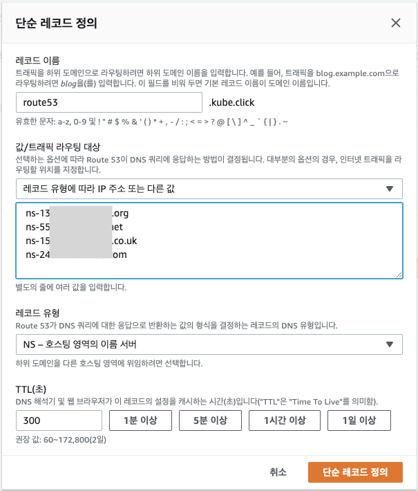 Route53 > 호스팅 영역 > kube.click > 레코드 생성